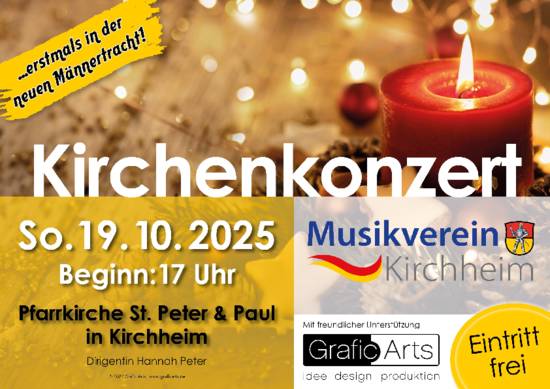 Am Sonntag, den 19. Oktober, laden wir euch um 17 Uhr recht herzlich zu unserem diesjährigen Kirchenkonzert in die Pfarrkirche St. Peter und Paul nach Kirchheim ein. Unsere Dirigentin Hannah Peter hat auch dieses Jahr wieder ein abwechslungsreiches und kurzweiliges Programm für euch zusammengestellt, Außerdem treten unsere Musiker erstmals in ihrer neuen Tracht auf. Der Eintritt ist frei.